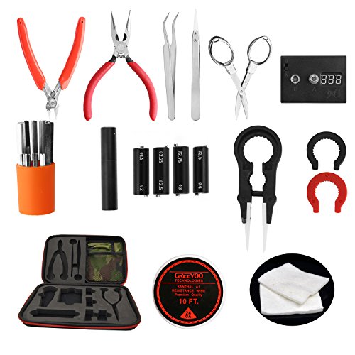 - UPDSATED FULL SET VAPE KIT INCLUDES: 1 x Tank Wrench(Multi-Functional Ceramic Vape Tweezers),1 x 8 In 1 Coil Building Jig,1 x Diagonal Pliers,1 x Needle-Nose Pliers,1 x Foldable Stainless Steel Scissors, 1 x Scimitar Stainless Tweezers,1 x Ohm Meter,1 x10FT Kanthal Heating Wire,3 Sheets of Organic Cotton.The vape tool kit brings you the vape coil building Set Solution! It offer you EVERYTHING and without costing you a fortune buying each piece individually. So do not hesitate, ENJOY IT NOW